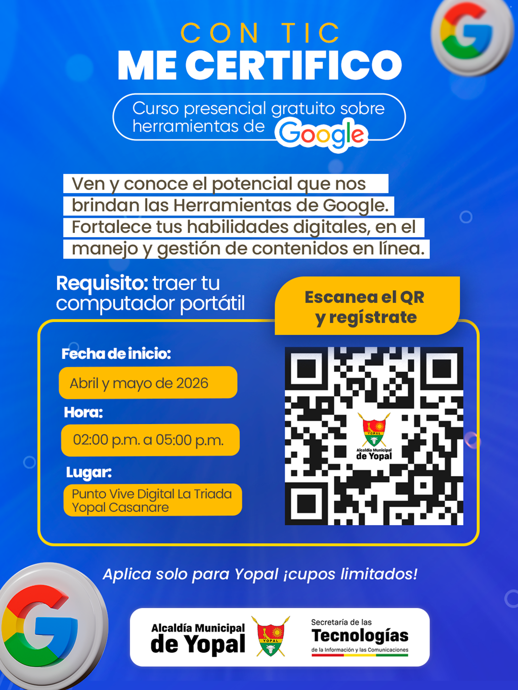 El curso comenzará en el mes de mayo, en horario de 2:00 p.m. a 5:00 p.m., y se desarrollará en el Punto Vive Digital. Como requisito fundamental, los participantes deberán contar con un computador portátil para el desarrollo de las actividades.