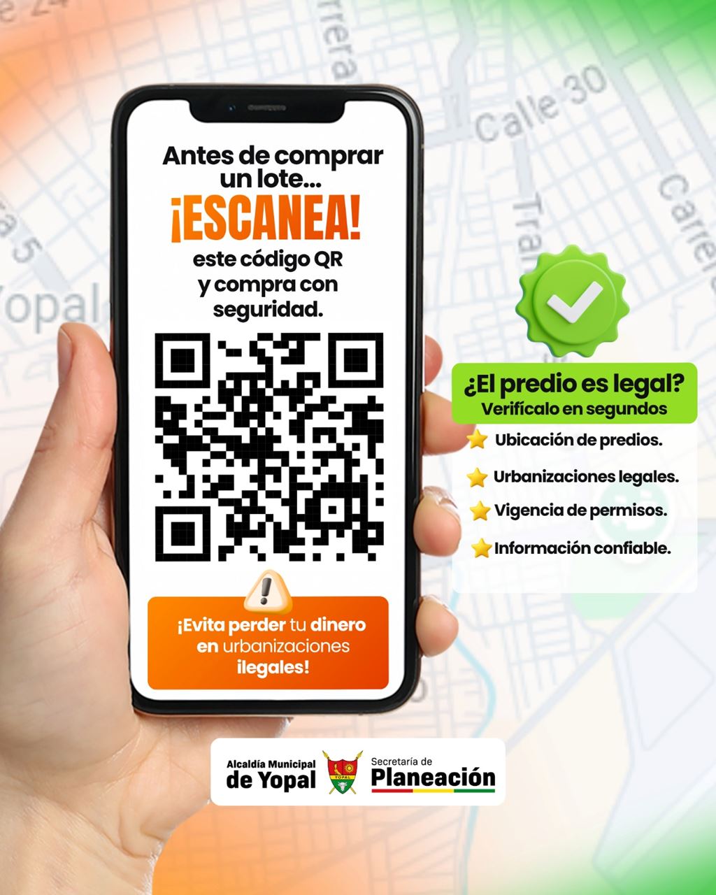 La Secretaría de Planeación de Yopal implementó una nueva herramienta tecnológica para brindar mayor transparencia y seguridad a los ciudadanos que deseen invertir en la compra de lotes o vivienda en el municipio. Se trata de un código QR que permite consultar de forma ágil y gratuita la legalidad de los proyectos urbanísticos.